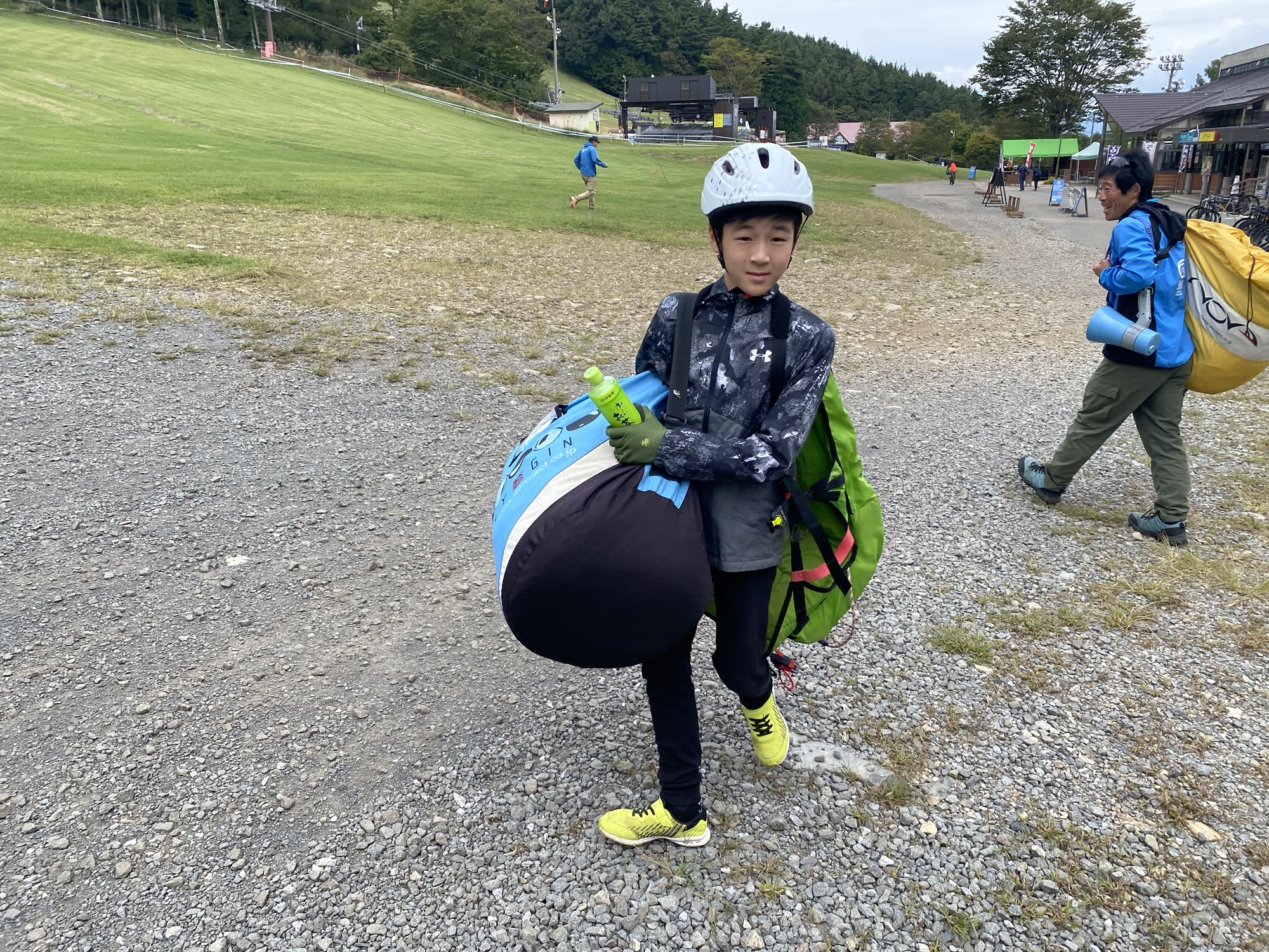 講習が終わるとパラグライダーを担いでゲレンデへ向かいます