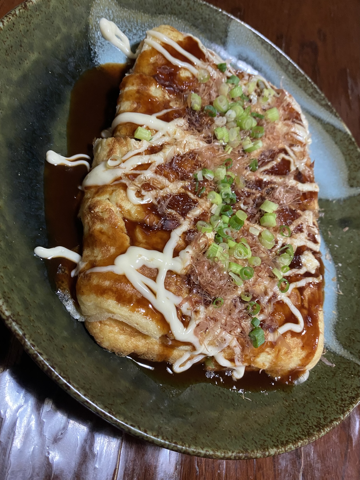 早速たこ焼きの生地をフライパンに流し込み、そこへタコネギ生姜揚げ玉を打っ込む ひっくり返せばもう完成✨