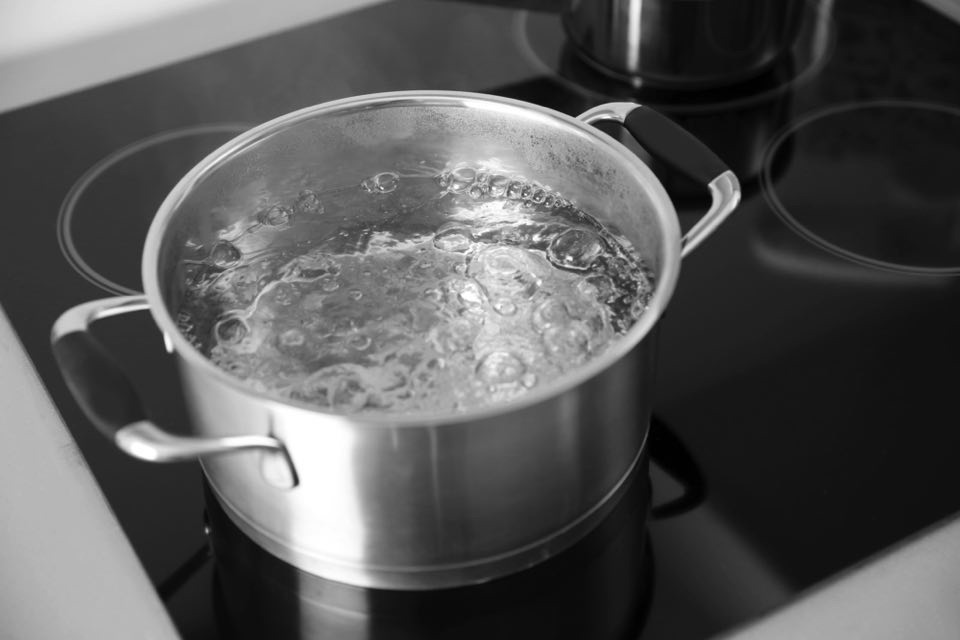 まず鍋に多めのお湯を沸かします、だいたい2リットル弱(適当) 鍋の湯が沸騰したらそこに水を半量入れます