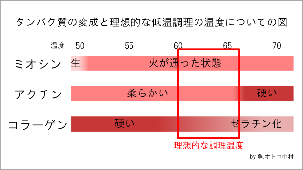 何故この温度にするかと言うと、筋原繊維のアクチンとミオシンが60度から70度で熱変成を始めるからです💪 これ以上高い温度だとカチカチに火が通ったお肉になってしまいます、70度以上にはしない様に気をつけましょう🙆♂️ 有る人は調理用の温度計を使うと確実ですが、大体指で分かると思う!